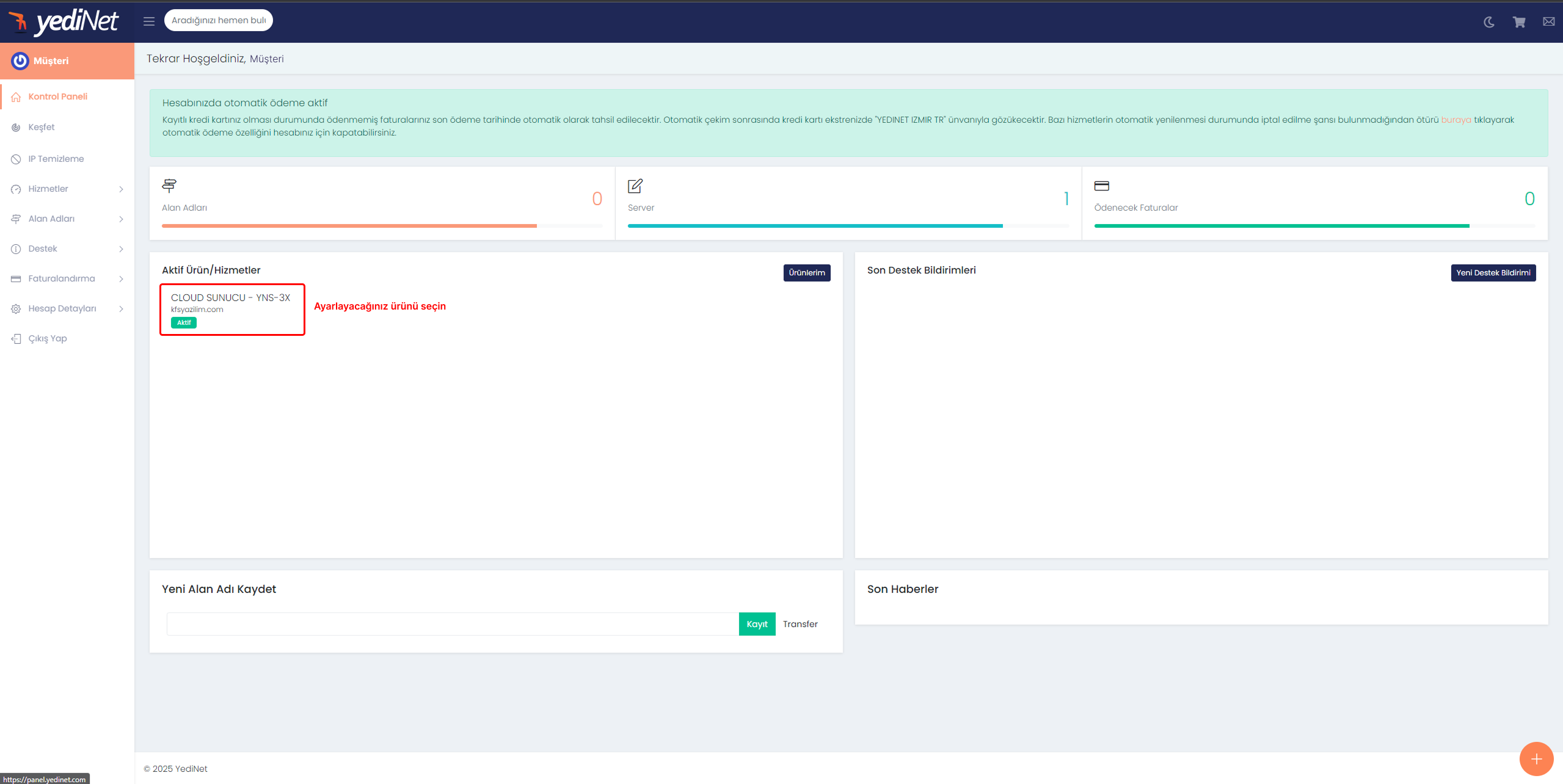 Panelinize ulaşmak için ilk yapmanız gereken Müşteri Panelimize giriş yapmanız. Daha sonrasında karşınıza çıkan panelden ürününüzü seçerek ürün sayfasına ulaşmanızdır.