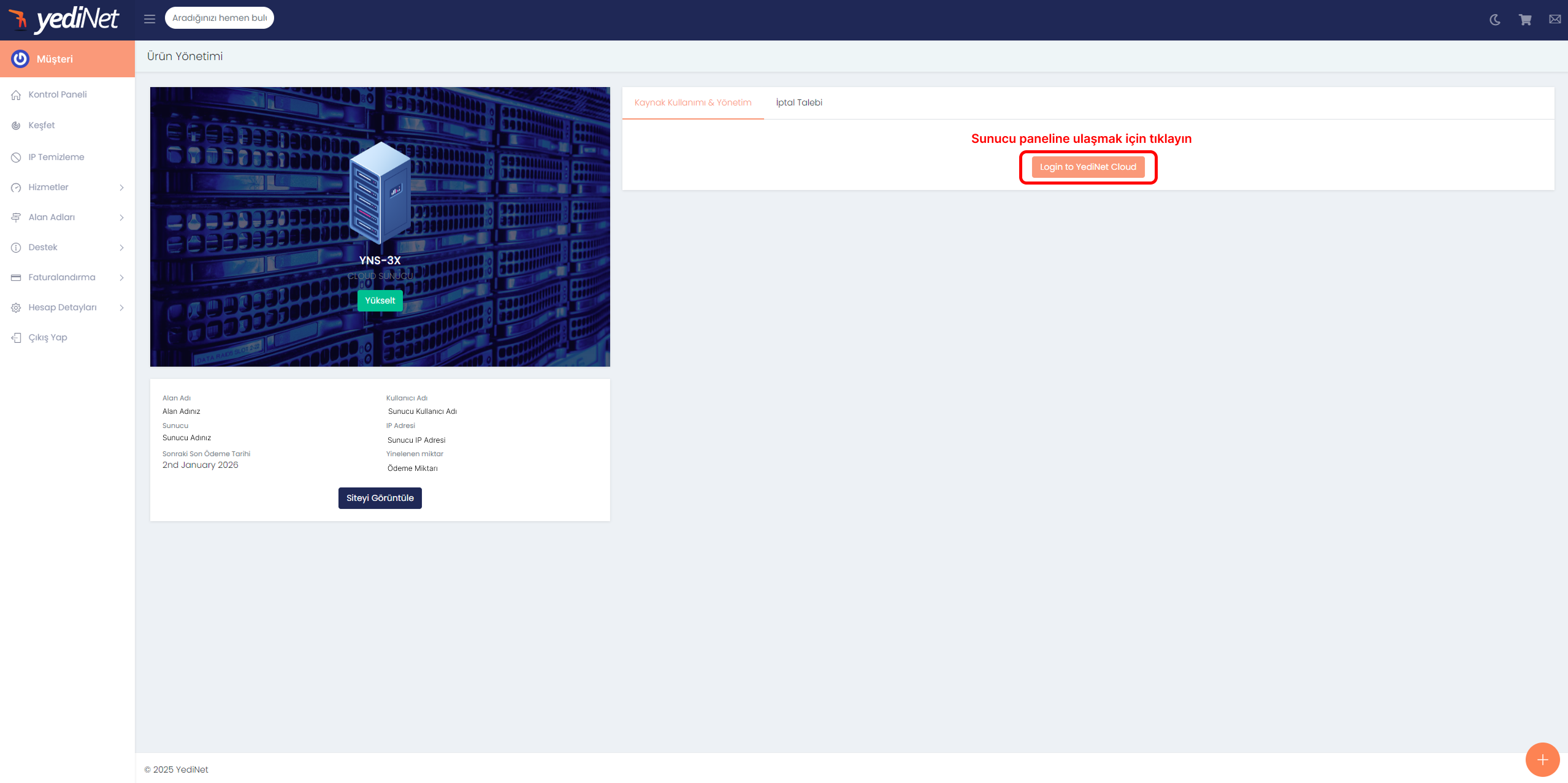 Ürün sayfasında karşınıza çıkan ürün bilgileri yanında turuncu bir kutu içinde bulunan Login to YediNet Cloud tuşuna basarak serverınızın bulunduğu yönetim paneline yönlendirileceksiniz.
