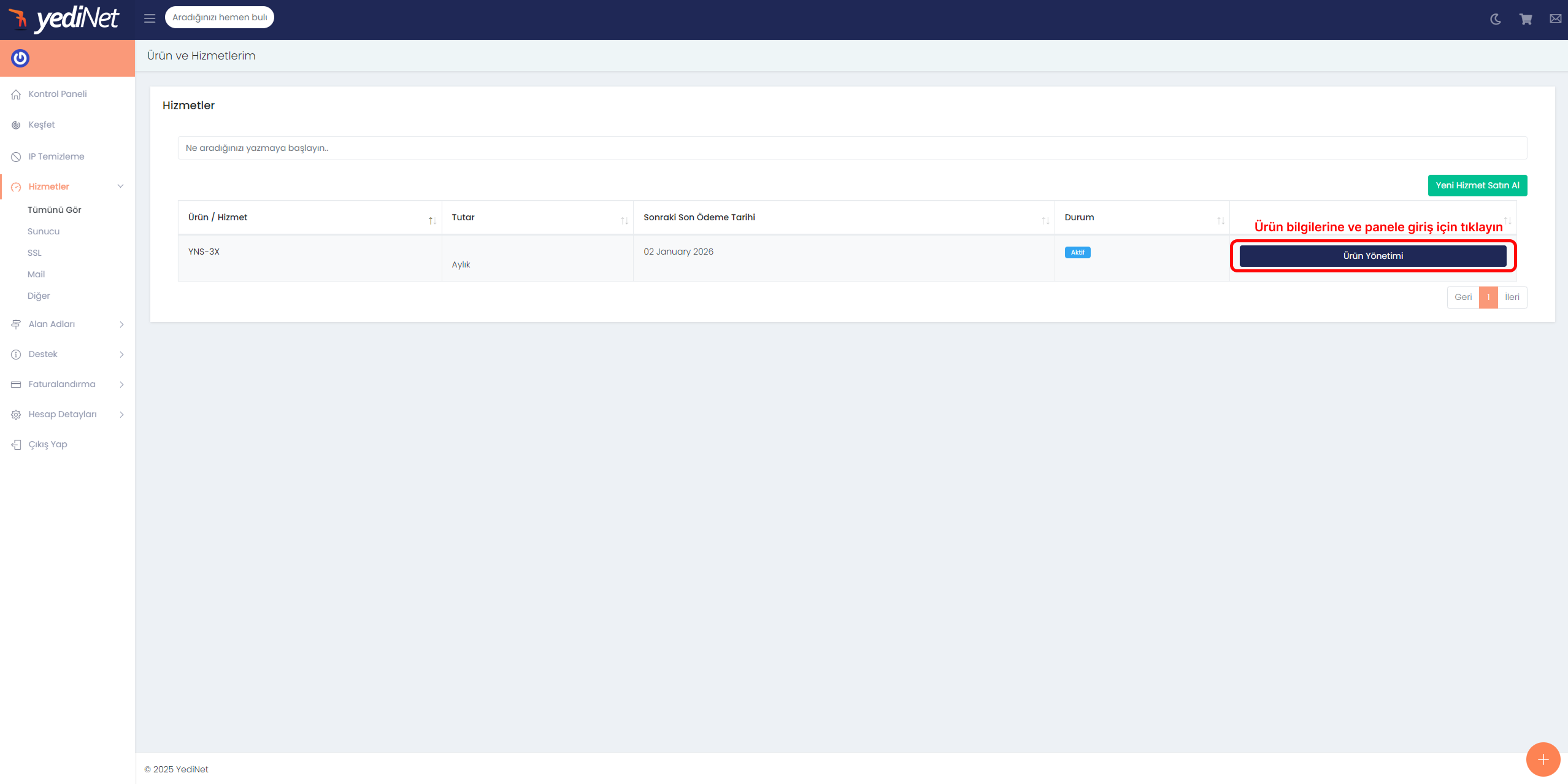 Panelinize ulaşmak için ilk yapmanız gereken Müşteri Panelimize giriş yapmanız. Daha sonrasında karşınıza çıkan panelden ürününüzü seçerek ürün sayfasına ulaşmanızdır.